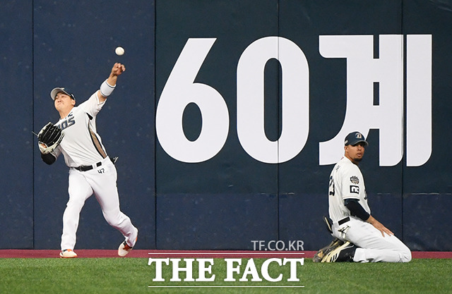 [더팩트ㅣ배정한 기자] '2020 신한은행 SOL KBO리그' 한국시리즈 1차전 두산 베어스와 NC 다이노스의 경기가 17일 오후 서울 구로구 고척스카이돔에서 열렸다. 6회초 NC 나성범(왼쪽)이 두산 박세혁의 타구를 잡은 뒤 홈으로 송구를 하고 있다.