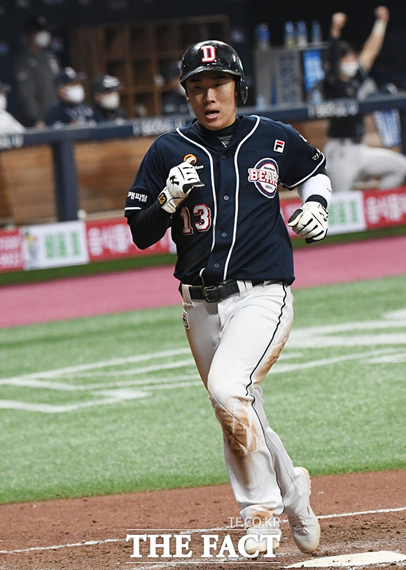 [더팩트ㅣ배정한 기자] '2020 신한은행 SOL KBO리그' 한국시리즈 1차전 두산 베어스와 NC 다이노스의 경기가 17일 오후 서울 구로구 고척스카이돔에서 열렸다. 6회초 두산 허경민이 홈을 밟고 있다.