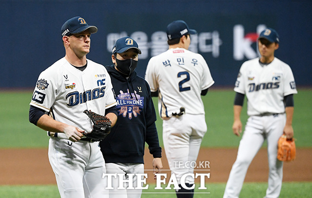 [더팩트ㅣ배정한 기자] '2020 신한은행 SOL KBO리그' 한국시리즈 1차전 두산 베어스와 NC 다이노스의 경기가 17일 오후 서울 구로구 고척스카이돔에서 열렸다. 6회초 NC 선발투수 루친스키가 마운드를 내려가고 있다.