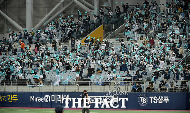 [더팩트|이선화 기자] '2020 KBO 포스트시즌' 한국시리즈 1차전 두산 베어스와 NC 다이노스의 경기가 17일 오후 서울 구로구 고척스카이돔에서 열린 가운데 관중들이 거리두기 속에 경기를 응원하고 있다.