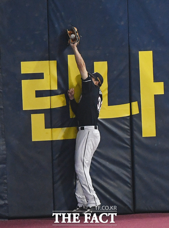 [더팩트ㅣ배정한 기자] '2020 신한은행 SOL KBO리그' 한국시리즈 1차전 두산 베어스와 NC 다이노스의 경기가 17일 오후 서울 구로구 고척스카이돔에서 열렸다. 6회말 두산 김재환이 NC 알테어의 타구를 잡고 있다. hany@tf.co.kr 사진영상기획부 photo@tf.co.kr