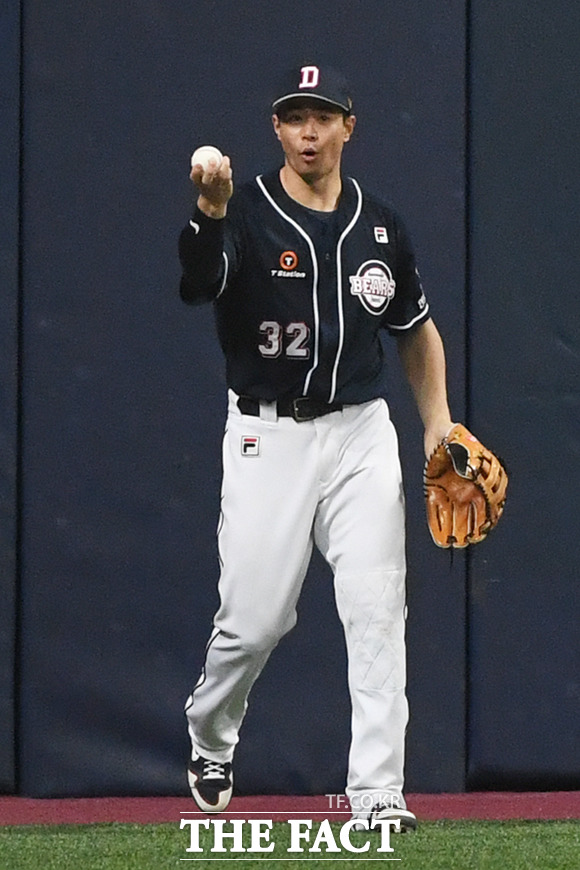 [더팩트ㅣ배정한 기자] '2020 신한은행 SOL KBO리그' 한국시리즈 1차전 두산 베어스와 NC 다이노스의 경기가 17일 오후 서울 구로구 고척스카이돔에서 열렸다. 6회말 두산 김재환이 NC 알테어의 타구를 잡은 뒤 기뻐하고 있다. hany@tf.co.kr 사진영상기획부 photo@tf.co.kr