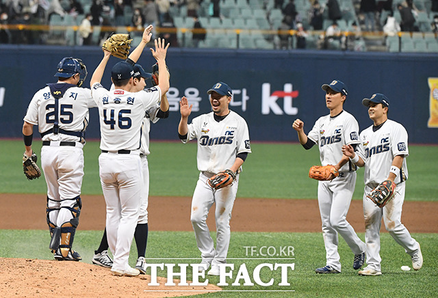 [더팩트ㅣ배정한 기자] '2020 신한은행 SOL KBO리그' 한국시리즈 1차전 두산 베어스와 NC 다이노스의 경기가 17일 오후 서울 구로구 고척스카이돔에서 열렸다. 9회초 승리를 확정지은 NC 선수들이 기뻐하고 있다. hany@tf.co.kr 사진영상기획부 photo@tf.co.kr