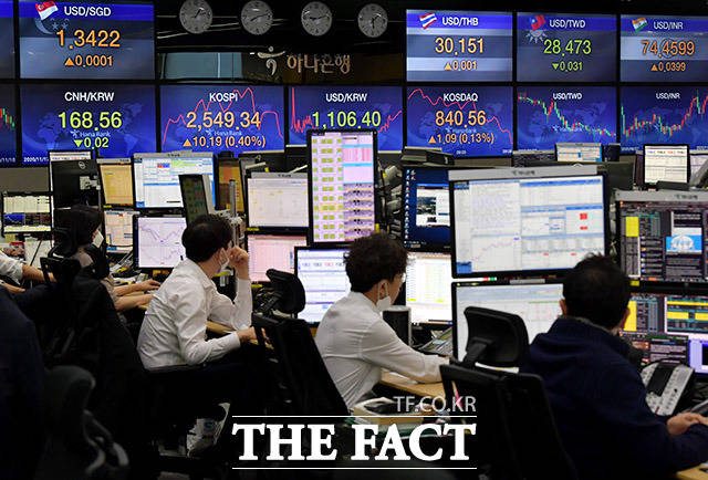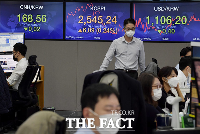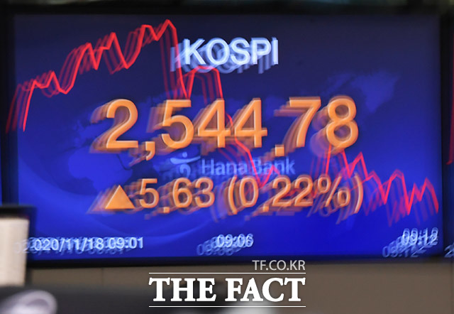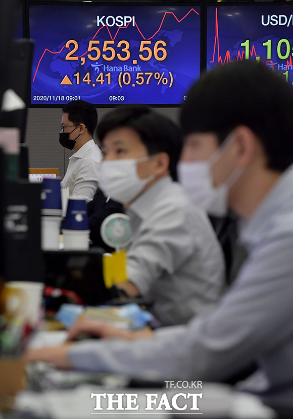 [더팩트ㅣ이덕인 기자] 코스피 지수가 전 거래일 대비 9.70포인트(0.38%) 오른 2,548.85에서 출발한 18일 오전 서울 을지로 하나은행 딜링룸 스크린에 코스피 종가가 떠 있다.