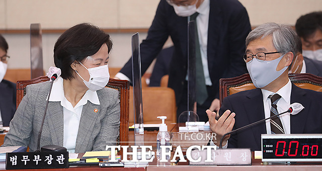 추미애 법무부장관이 18일 오전 서울 여의도 국회 법사위 회의실에서 열린 법제사법위원회 전체회의에 출석해 관계자로부터 답변자료에 대해 듣고 있다. /국회=이새롬 기자