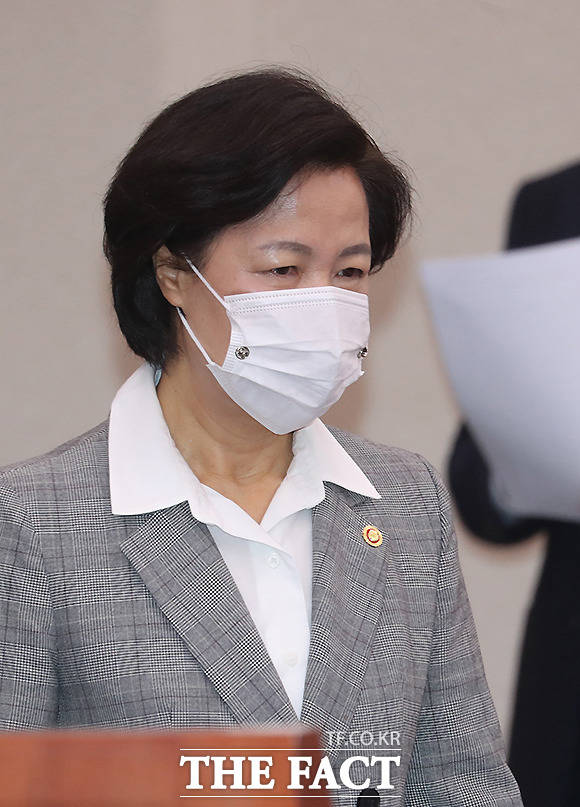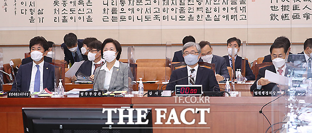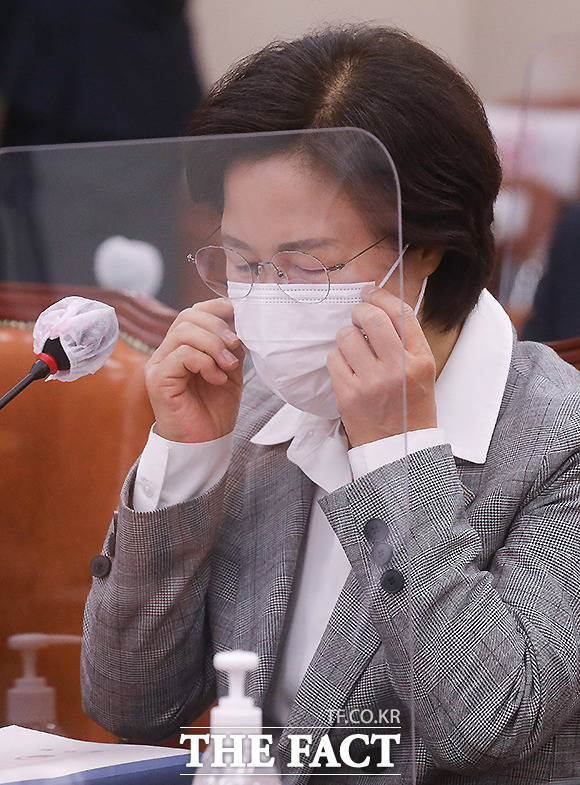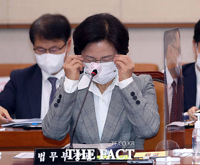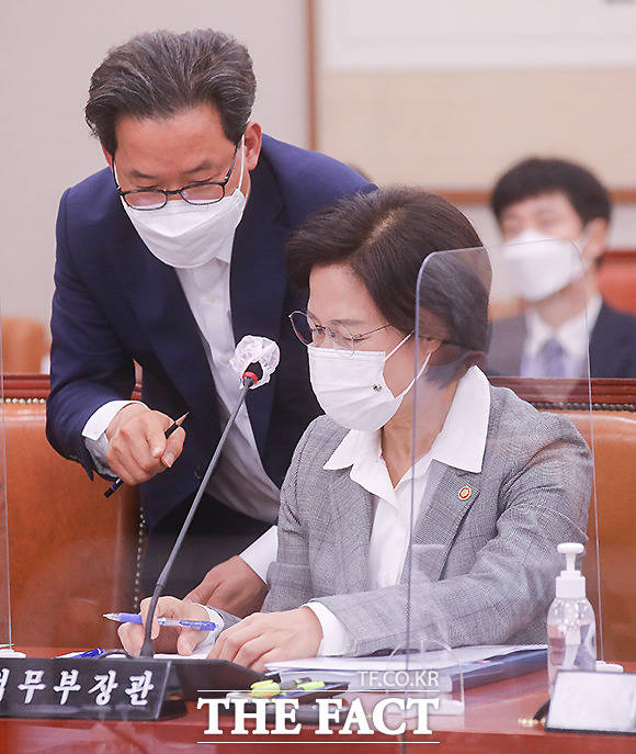 [더팩트ㅣ국회=이새롬 기자] 추미애 법무부장관이 18일 오전 서울 여의도 국회 법사위 회의실에서 열린 법제사법위원회 전체회의에 출석해 관계자로부터 답변자료에 대해 듣고 있다.