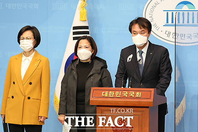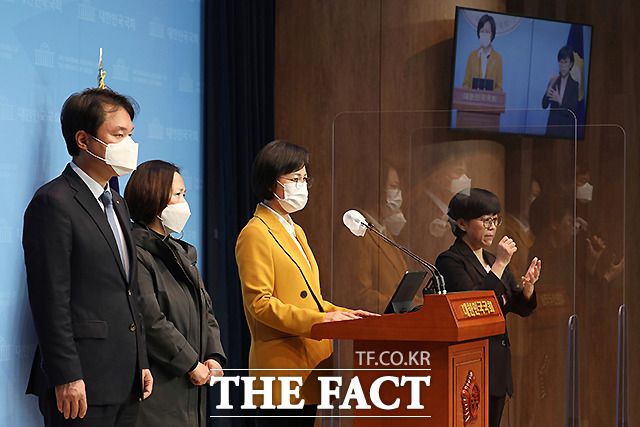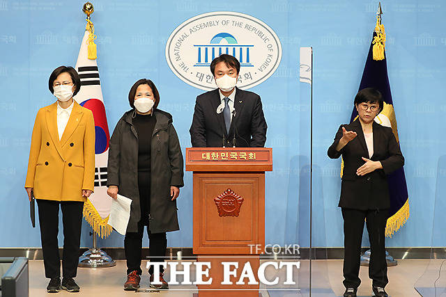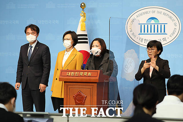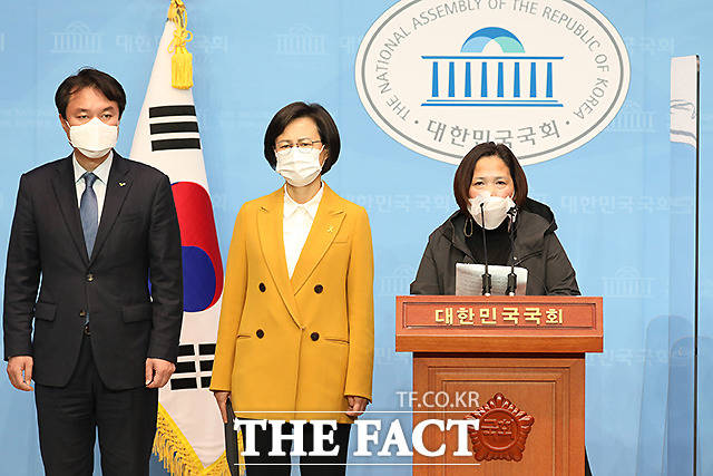 [더팩트ㅣ국회=이새롬 기자] 고 김용균 노동자 어머니 김미숙 김용균재단 대표(오른쪽)가 18일 국회 소통관에서 정의당 중대재해기업처벌법 제정 촉구 기자회견에 참석해 발언하고 있다. 사진은 왼쪽부터 김종철 정의당 대표와 강은미 원내대표, 김 대표.