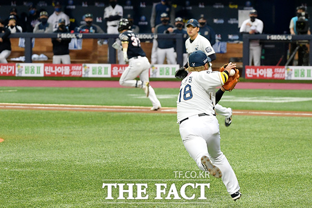 [더팩트|이선화 기자] '2020 KBO 포스트시즌' 한국시리즈 2차전 두산 베어스와 NC 다이노스의 경기가 18일 오후 서울 구로구 고척스카이돔에서 열린 가운데 2회초 NC 박석민이 두산 박건우가 친 공을 잡은 후 1루를 향해 공을 던지고 있다.seonflower@tf.co.kr사진영상기획부 photo@tf.co.kr