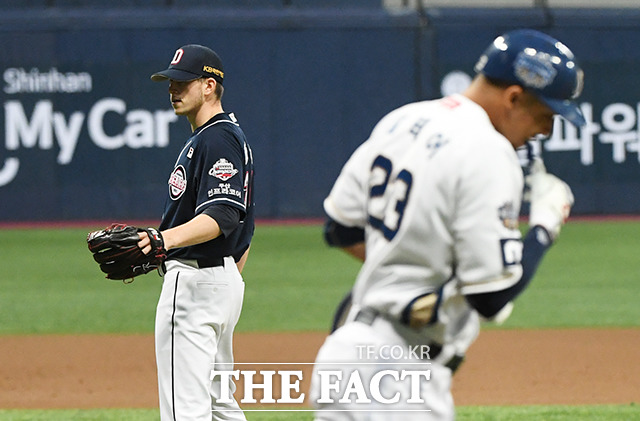 [더팩트ㅣ배정한 기자] '2020 신한은행 SOL KBO리그' 포스트시즌 두산 베어스와 NC 다이노스의 한국시리즈 2차전 경기가 18일 오후 서울 구로구 고척스카이돔에서 열렸다. 2회말 두산 선발투수 플렉센이 NC 알테어에게 볼넷을 허용한 뒤 아쉬워하고 있다. hany@tf.co.kr 사진영상기획부 photo@tf.co.kr