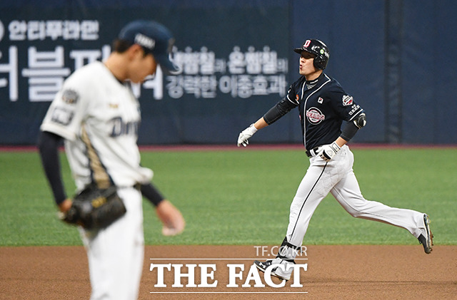 [더팩트ㅣ배정한 기자] '2020 신한은행 SOL KBO리그' 포스트시즌 두산 베어스와 NC 다이노스의 한국시리즈 2차전 경기가 18일 오후 서울 구로구 고척스카이돔에서 열렸다. 4회초 두산 김재호가 홈런을 친 뒤 기뻐하고 있다.