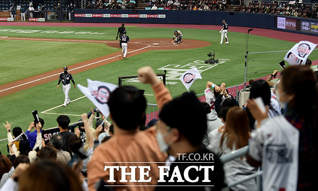[더팩트|이선화 기자] '2020 KBO 포스트시즌' 한국시리즈 2차전 두산 베어스와 NC 다이노스의 경기가 18일 오후 서울 구로구 고척스카이돔에서 열린 가운데 4회초 두산 김재호가 솔로 홈런을 친 후 그라운드를 돌자 관중들이 환호하고 있다.seonflower@tf.co.kr사진영상기획부 photo@tf.co.kr