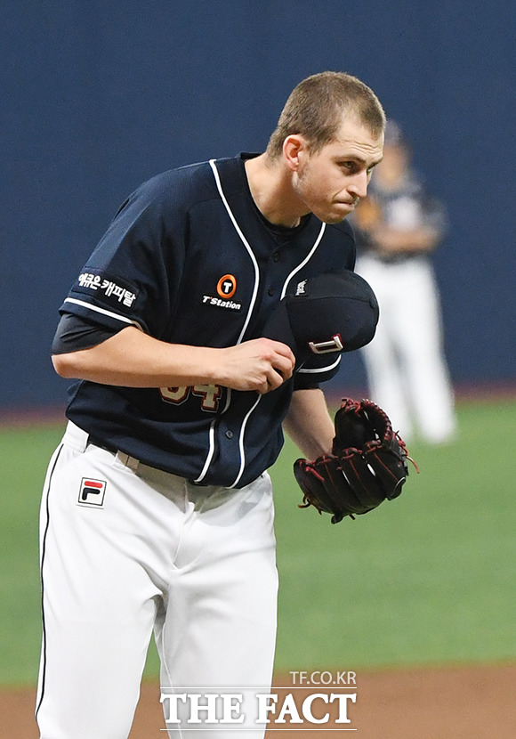 [더팩트ㅣ배정한 기자] '2020 신한은행 SOL KBO리그' 포스트시즌 두산 베어스와 NC 다이노스의 한국시리즈 2차전 경기가 18일 오후 서울 구로구 고척스카이돔에서 열렸다. 4회말 두산 플렉센이 공에 맞은 NC 권희동에게 사과를 하고 있다.