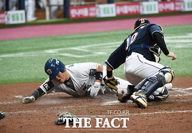 [더팩트ㅣ배정한 기자] '2020 신한은행 SOL KBO리그' 포스트시즌 두산 베어스와 NC 다이노스의 한국시리즈 2차전 경기가 18일 오후 서울 구로구 고척스카이돔에서 열렸다. 4회말 두산 박세혁이 홈 슬라이딩을 하는 NC 양의지(왼쪽)를 포스아웃 시키고 있다.