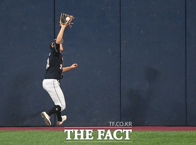 [더팩트ㅣ배정한 기자] '2020 신한은행 SOL KBO리그' 포스트시즌 두산 베어스와 NC 다이노스의 한국시리즈 2차전 경기가 18일 오후 서울 구로구 고척스카이돔에서 열렸다. 7회말 두산 정수빈이 NC 노진혁의 타구를 잡고 있다. hany@tf.co.kr 사진영상기획부 photo@tf.co.kr