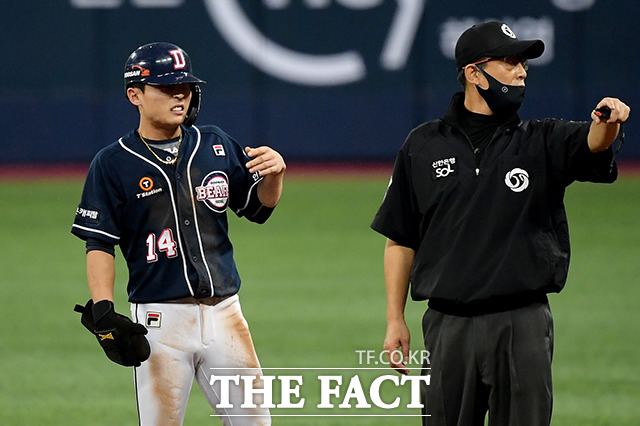[더팩트|이선화 기자] '2020 KBO 포스트시즌' 한국시리즈 2차전 두산 베어스와 NC 다이노스의 경기가 18일 오후 서울 구로구 고척스카이돔에서 열린 가운데 8회초 두산 이유찬이 2루로 진루한 후 왼쪽 팔에 고통을 호소하고 있다.seonflower@tf.co.kr사진영상기획부 photo@tf.co.kr