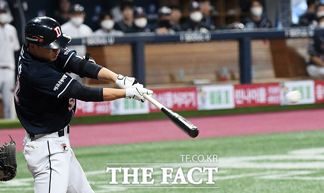 [더팩트ㅣ배정한 기자] '2020 신한은행 SOL KBO리그' 포스트시즌 두산 베어스와 NC 다이노스의 한국시리즈 2차전 경기가 18일 오후 서울 구로구 고척스카이돔에서 열렸다. 8회초 두산 김재호가 안타를 치고 있다.