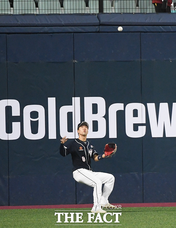 [더팩트ㅣ배정한 기자] '2020 신한은행 SOL KBO리그' 포스트시즌 두산 베어스와 NC 다이노스의 한국시리즈 2차전 경기가 18일 오후 서울 구로구 고척스카이돔에서 열렸다. 9회말 두산 조수행이 Nc 양의지의 타구를 놓치고 있다.