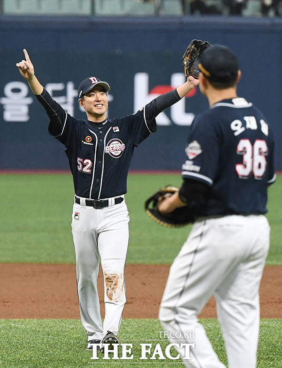 [더팩트ㅣ배정한 기자] '2020 신한은행 SOL KBO리그' 포스트시즌 두산 베어스와 NC 다이노스의 한국시리즈 2차전 경기가 18일 오후 서울 구로구 고척스카이돔에서 열렸다. 두산 김재호가 5-4 승리를 확정지은 뒤 기뻐하고 있다. hany@tf.co.kr 사진영상기획부 photo@tf.co.kr