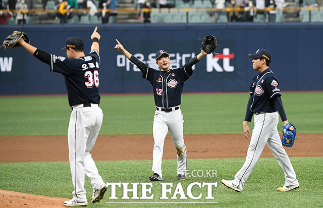 [더팩트ㅣ배정한 기자] '2020 신한은행 SOL KBO리그' 포스트시즌 두산 베어스와 NC 다이노스의 한국시리즈 2차전 경기가 18일 오후 서울 구로구 고척스카이돔에서 열렸다. 두산 김재호(가운데)가 5-4 승리를 확정지은 뒤 기뻐하고 있다. hany@tf.co.kr 사진영상기획부 photo@tf.co.kr