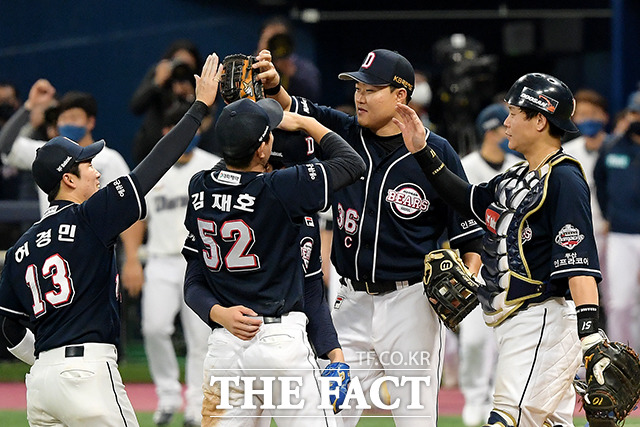 [더팩트|이선화 기자] '2020 KBO 포스트시즌' 한국시리즈 2차전 두산 베어스와 NC 다이노스의 경기가 18일 오후 서울 구로구 고척스카이돔에서 열린 가운데 두산 선수들이 승리의 기쁨을 나누고 있다.