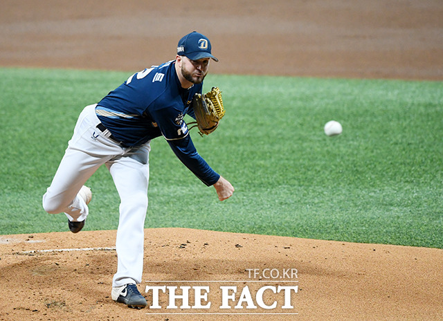 [더팩트ㅣ배정한 기자] '2020 신한은행 SOL KBO리그' 포스트시즌 두산 베어스와 NC 다이노스의 한국시리즈 3차전 경기가 20일 오후 서울 구로구 고척스카이돔에서 열렸다. 1회말 NC 선발투수 라이트가 역투를 하고 있다.