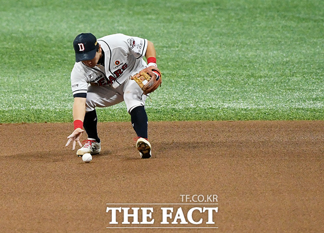[더팩트ㅣ배정한 기자] '2020 신한은행 SOL KBO리그' 포스트시즌 두산 베어스와 NC 다이노스의 한국시리즈 3차전 경기가 20일 오후 서울 구로구 고척스카이돔에서 열렸다. 4회말 두산 최주환이 NC 노진혁의 타구를 맨손으로 잡고 있다.