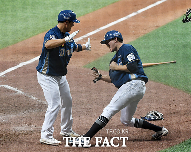 [더팩트ㅣ배정한 기자] '2020 신한은행 SOL KBO리그' 포스트시즌 두산 베어스와 NC 다이노스의 한국시리즈 3차전 경기가 20일 오후 서울 구로구 고척스카이돔에서 열렸다. 4회초 NC 박민우가 홈을 밟은 뒤 기뻐하고 있다. hany@tf.co.kr 사진영상기획부 photo@tf.co.kr
