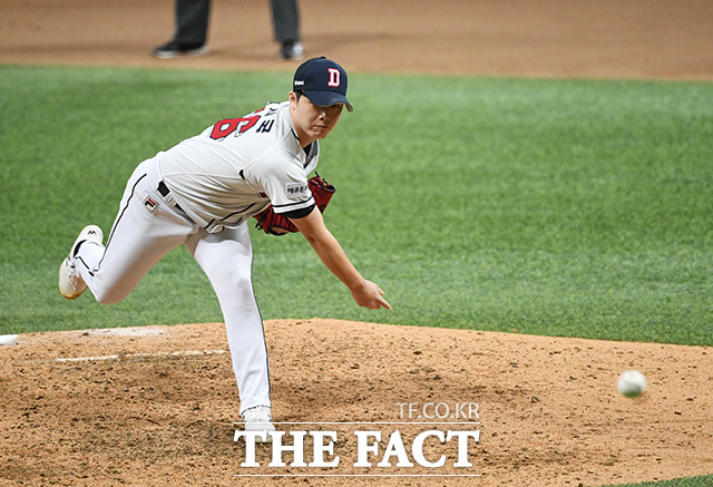 [더팩트ㅣ배정한 기자] '2020 신한은행 SOL KBO리그' 포스트시즌 두산 베어스와 NC 다이노스의 한국시리즈 3차전 경기가 20일 오후 서울 구로구 고척스카이돔에서 열렸다. 7회초 두산 박치국이 역투를 하고 있다.