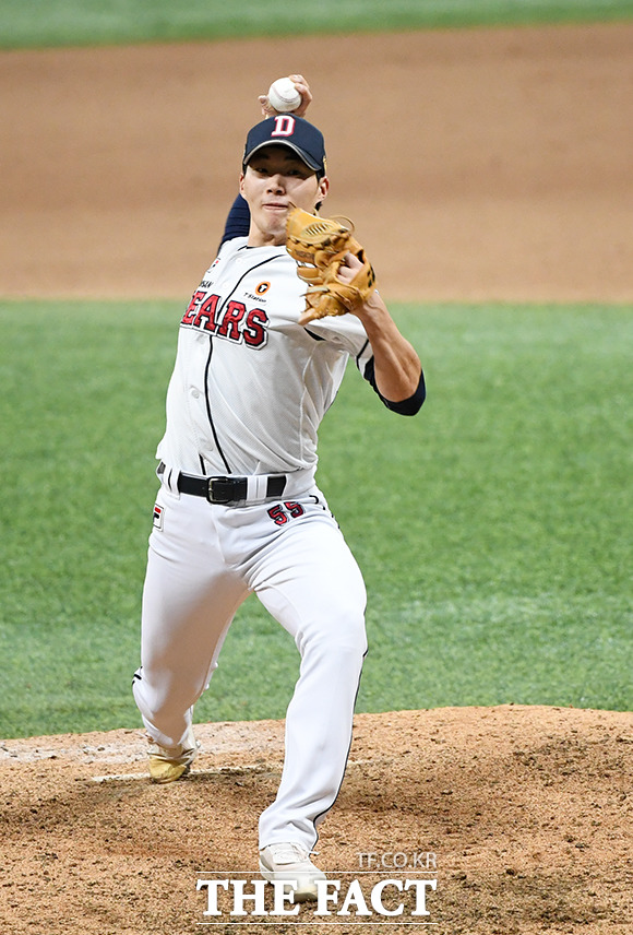 [더팩트ㅣ배정한 기자] '2020 신한은행 SOL KBO리그' 포스트시즌 두산 베어스와 NC 다이노스의 한국시리즈 3차전 경기가 20일 오후 서울 구로구 고척스카이돔에서 열렸다. 9회초 두산 이승진이 역투를 하고 있다.