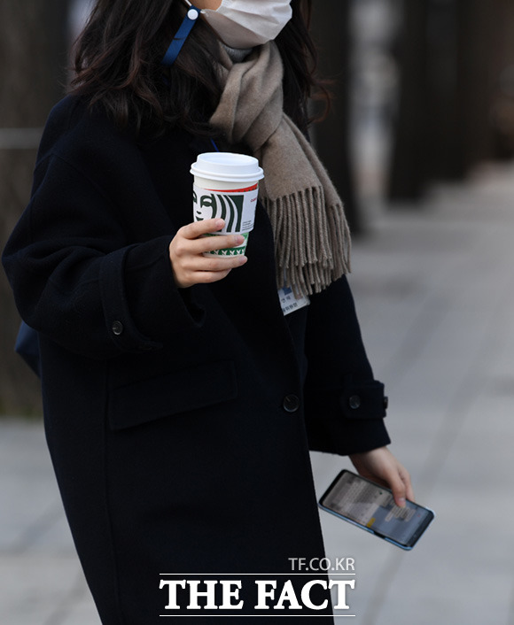 [더팩트ㅣ임세준 기자] 전국적으로 추위가 찾아온 23일 오전 서울 종로구 광화문사거리에서 한 시민이 따듯한 커피를 들고 거리를 지나고 있다.