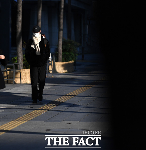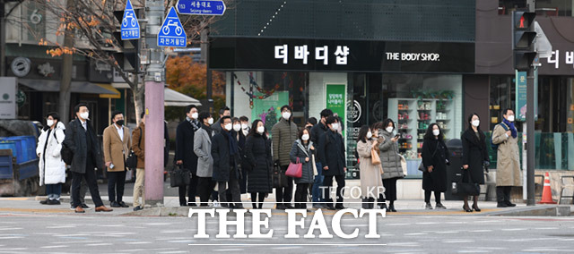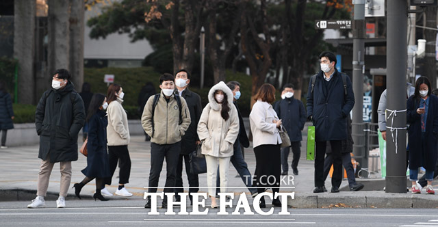 [더팩트ㅣ임세준 기자] 전국적으로 추위가 찾아온 23일 오전 서울 종로구 광화문사거리의 시민들이 두꺼운 옷차림으로 거리를 지나고 있다.