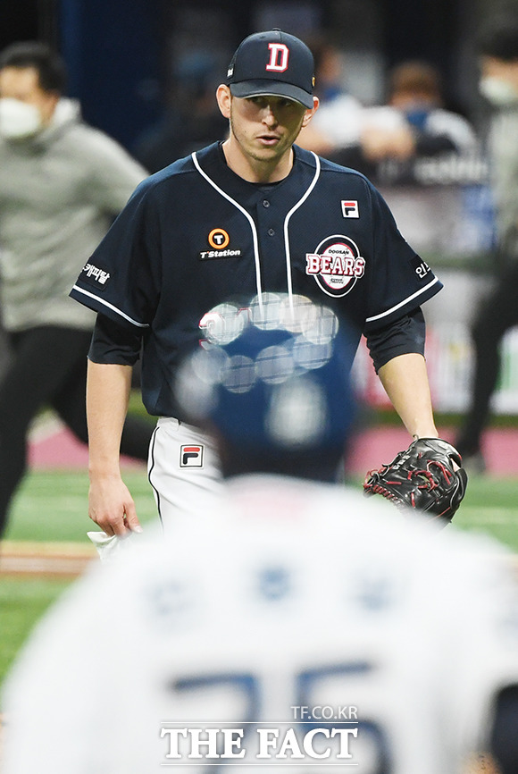 [더팩트ㅣ배정한 기자] '2020 신한은행 SOL KBO리그' 포스트시즌 두산 베어스와 NC 다이노스의 한국시리즈 5차전 경기가 23일 오후 서울 구로구 고척스카이돔에서 열렸다. 3회말 두산 선발투수 플렉센이 이닝을 끝낸 뒤 마운드를 내려오고 있다.