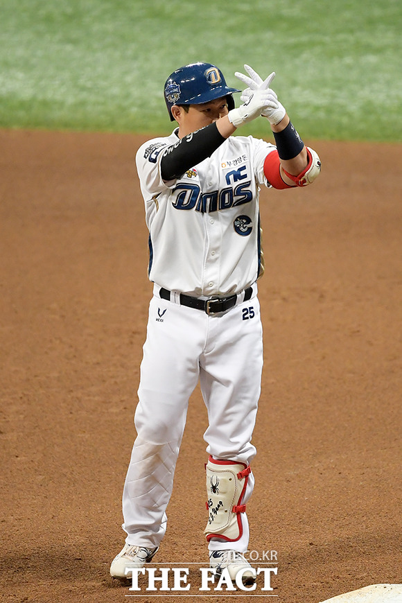[더팩트|이선화 기자] '2020 KBO 포스트시즌' 한국시리즈 5차전 두산 베어스와 NC 다이노스의 경기가 23일 오후 서울 구로구 고척스카이돔에서 열린 가운데 4회말 NC 양의지가 안타를 치고 1루 베이스를 밟은 후 세리머니를 하고 있다.seonflower@tf.co.kr사진영상기획부 photo@tf.co.kr