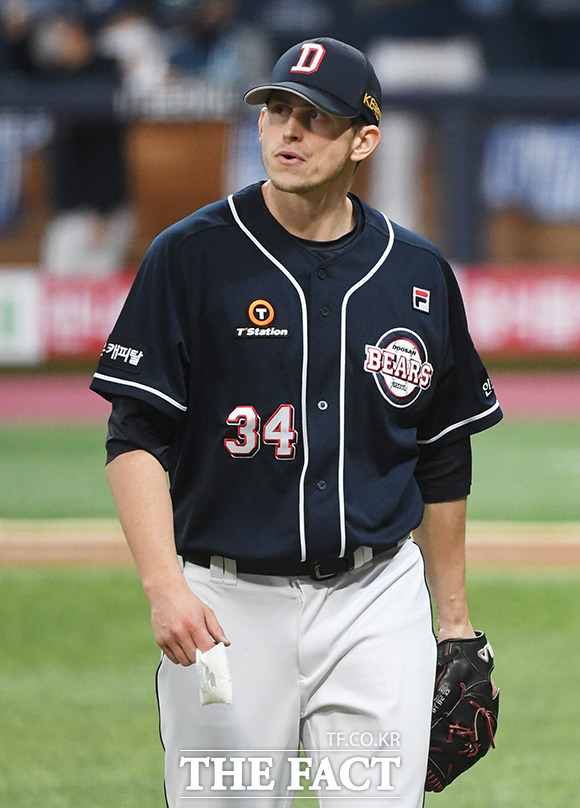 [더팩트ㅣ배정한 기자] '2020 신한은행 SOL KBO리그' 포스트시즌 두산 베어스와 NC 다이노스의 한국시리즈 5차전 경기가 23일 오후 서울 구로구 고척스카이돔에서 열렸다. 4회말 두산 선발투수 플렉센이 실점 위기를 넘긴 뒤 한숨을 쉬고 있다. hany@tf.co.kr 사진영상기획부 photo@tf.co.kr