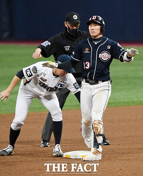 [더팩트ㅣ배정한 기자] '2020 신한은행 SOL KBO리그' 포스트시즌 두산 베어스와 NC 다이노스의 한국시리즈 5차전 경기가 23일 오후 서울 구로구 고척스카이돔에서 열렸다. 5회초 두산 허경민이 2루 베이스를 밟은 뒤 상황을 확인하고 있다. hany@tf.co.kr 사진영상기획부 photo@tf.co.kr