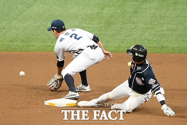 [더팩트|이선화 기자] '2020 KBO 포스트시즌' 한국시리즈 5차전 두산 베어스와 NC 다이노스의 경기가 23일 오후 서울 구로구 고척스카이돔에서 열린 가운데 5회초 두산 허경민이 안타를 친 후 2루 베이스를 향해 슬라이딩을 하고 있다.seonflower@tf.co.kr사진영상기획부 photo@tf.co.kr