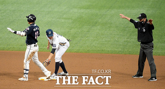 [더팩트|이선화 기자] '2020 KBO 포스트시즌' 한국시리즈 5차전 두산 베어스와 NC 다이노스의 경기가 23일 오후 서울 구로구 고척스카이돔에서 열린 가운데 5회초 두산 허경민이 2루타를 친 후 세이프를 외치고 있다.