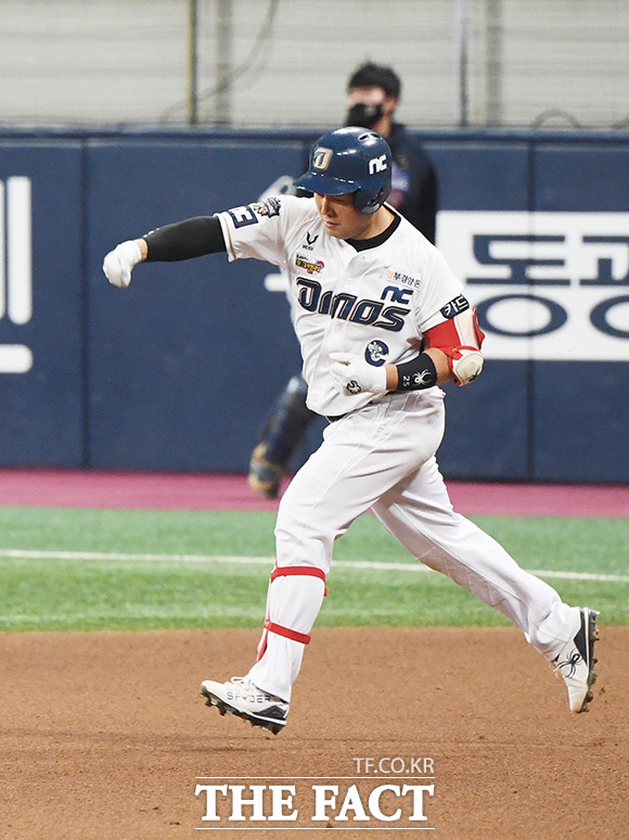 [더팩트ㅣ배정한 기자] '2020 신한은행 SOL KBO리그' 포스트시즌 두산 베어스와 NC 다이노스의 한국시리즈 5차전 경기가 23일 오후 서울 구로구 고척스카이돔에서 열렸다. 6회말 NC 양의지가 2점 홈런을 친 뒤 기뻐하고 있다.