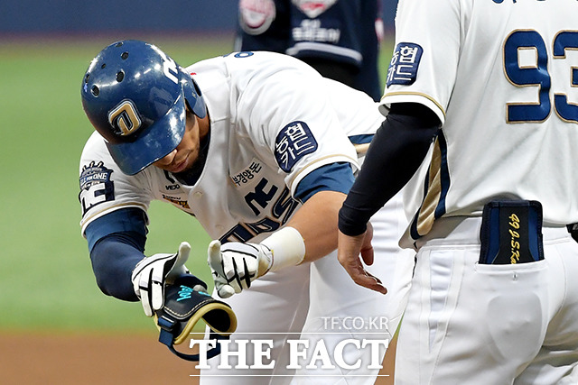 [더팩트|이선화 기자] '2020 KBO 포스트시즌' 한국시리즈 6차전 두산 베어스와 NC 다이노스의 경기가 24일 오후 서울 구로구 고척스카이돔에서 열린 가운데 4회말 NC 알테어가 안타를 친 후 세리머니를 하고 있다.seonflower@tf.co.kr사진영상기획부 photo@tf.co.kr