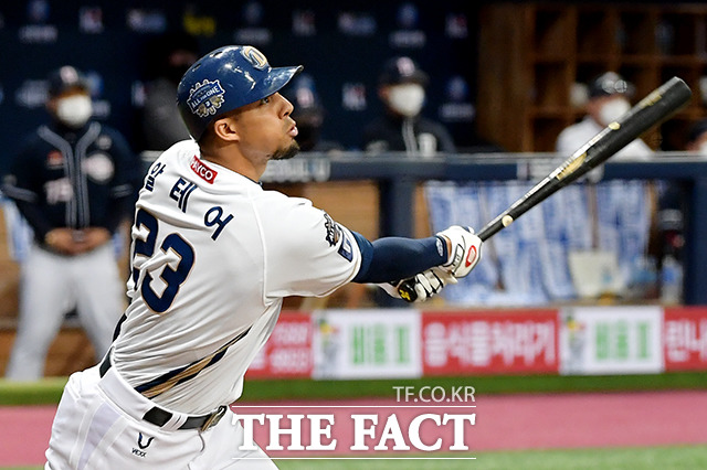 [더팩트|이선화 기자] '2020 KBO 포스트시즌' 한국시리즈 6차전 두산 베어스와 NC 다이노스의 경기가 24일 오후 서울 구로구 고척스카이돔에서 열린 가운데 6회말 NC 알테어가 2루타를 치고 있다.seonflower@tf.co.kr사진영상기획부 photo@tf.co.kr