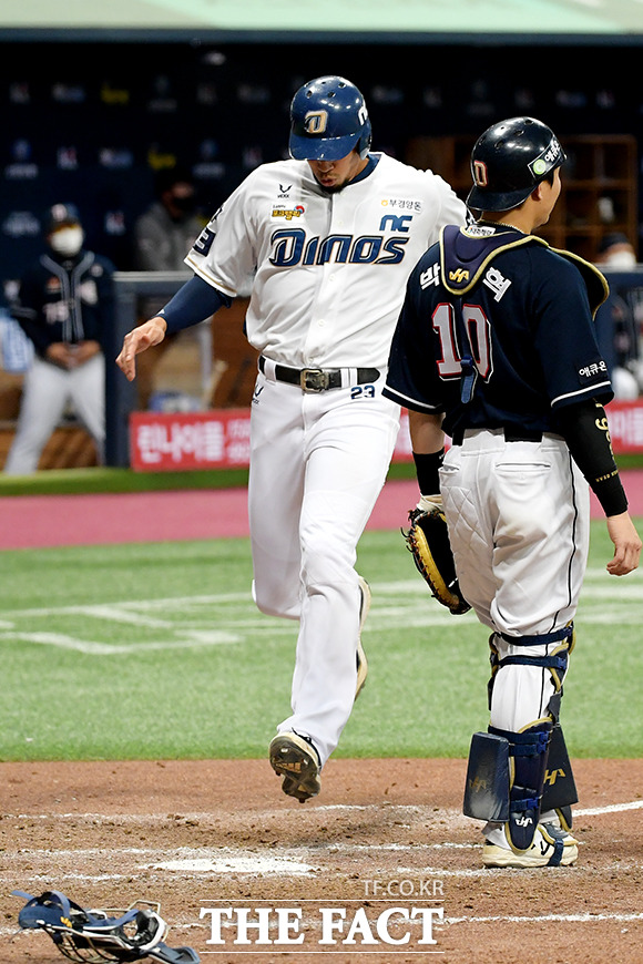 [더팩트|이선화 기자] '2020 KBO 포스트시즌' 한국시리즈 6차전 두산 베어스와 NC 다이노스의 경기가 24일 오후 서울 구로구 고척스카이돔에서 열린 가운데 6회말 NC 알테어가 홈 베이스를 밟고 있다.