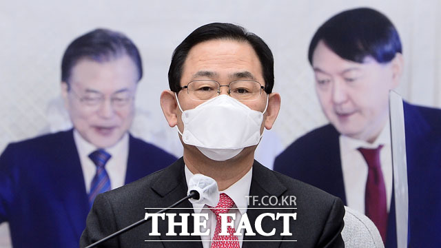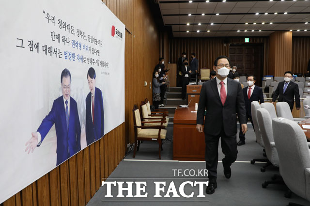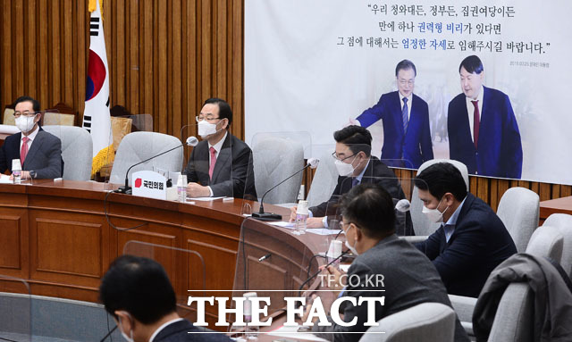 [TF사진관] 국민의힘 회의 배경지에 '문재인 대통령과 윤석열'