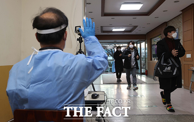 [더팩트ㅣ사진공동취재단] 2021학년도 대학수학능력시험(수능)일인 3일 오전 서울 서초구 서초고등학교에서 수험생들이 발열 체크 후 고사장에 입실하고 있다.darkroom@tf.co.kr사진영상기획부 photo@tf.co.kr