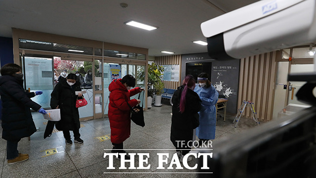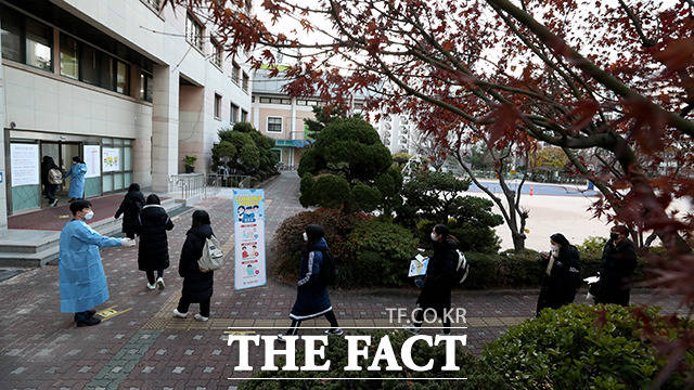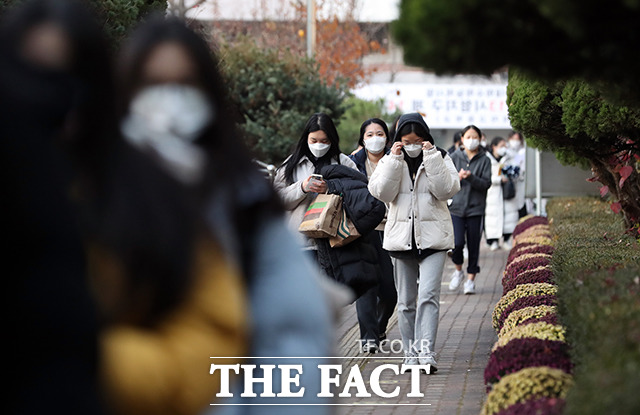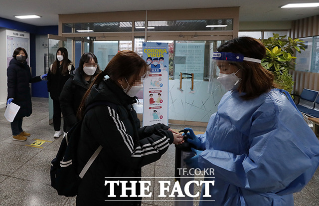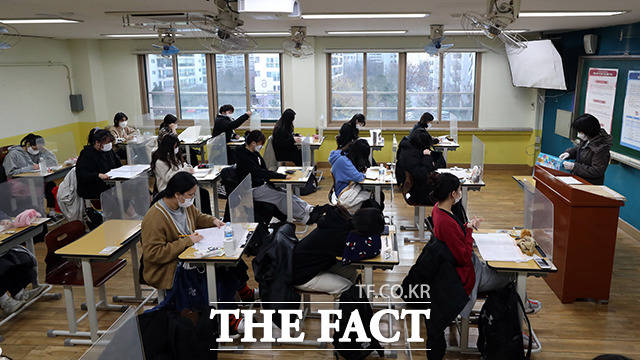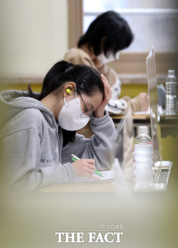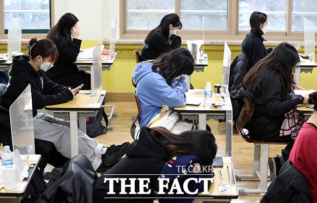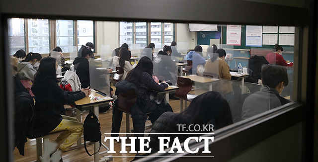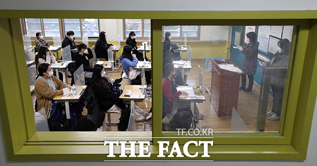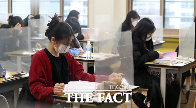 [더팩트ㅣ사진공동취재단] 2021학년도 대학수학능력시험일인 3일 오전 서울 영등포구 여의도여자고등학교에 마련된 시험장에서 수험생들이 시험 시작을 기다리고 있다.