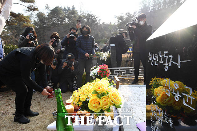 [더팩트ㅣ남양주=남용희 기자] 고 김용균 노동자 2주기 마석 추모제가 6일 오후 경기도 남양주시 모란공원에서 진행된 가운데 고인의 어머니인 김미숙 김용균재단 대표가 아들에게 인사를 하고 있다.