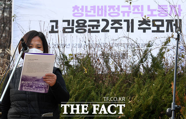 [더팩트ㅣ남양주=남용희 기자] 고 김용균 노동자 2주기 마석 추모제가 6일 오후 경기도 남양주시 모란공원에서 진행된 가운데 고인의 어머니인 김미숙 김용균재단 대표가 유가족 인사말을 하고 있다.