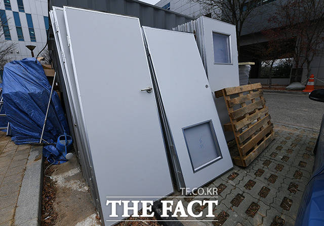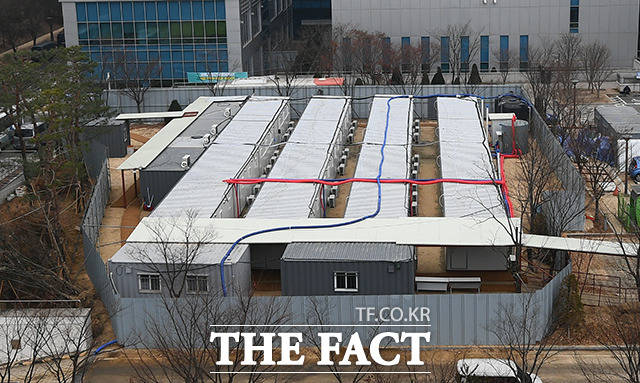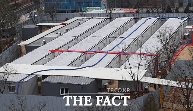 [더팩트ㅣ이동률 기자] 코로나19 확진자 증가로 인한 병상 부족 우려가 계속되고 있는 21일 오전 서울 중랑구 서울의료원에 컨테이너식 이동병상이 설치된 모습을 보이고 있다.