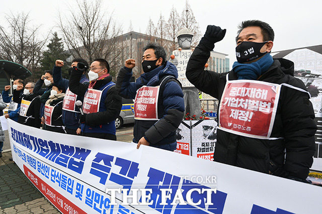 [더팩트ㅣ이동률 기자] 중대재해기업처벌법 즉각 제정을 촉구하는 단식돌입 선포 기자회견이 29일 오전 서울 영등포구 국회 앞에서 열린 가운데 참가자들이 구호를 외치고 있다.