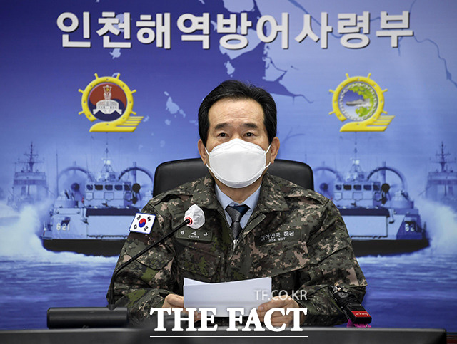 [더팩트ㅣ사진공동취재단] 정세균 국무총리가 29일 오후 인천광역시 중구 해군 인천해역방어사령부를 방문해 인사말을 하고 있다.