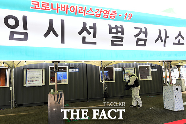 [더팩트ㅣ남용희 기자] 3일 오후 서울 용산구 서울역에 마련된 코로나19 임시선별검사소에서 한 관계자가 소독을 하고 있다.